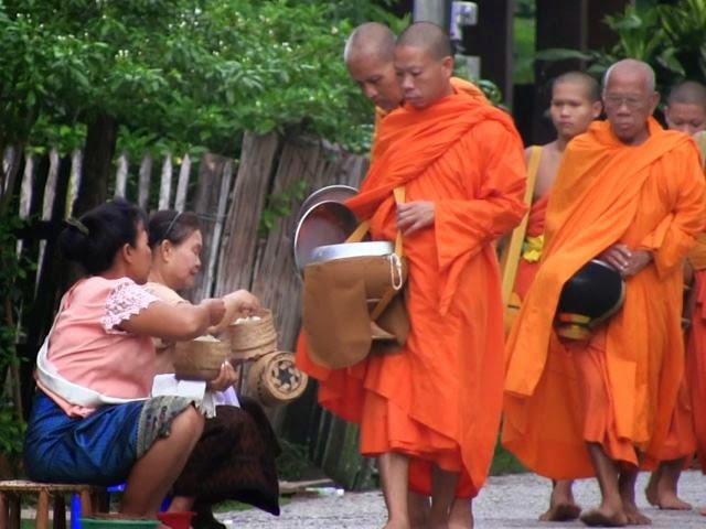 I set an alarm this morning on my phone so I could get up and see the monks taking alms. The reason I had to use the alarm on my phone was because none of the four hotels we stayed at, in three different countries, had any kind of a clock in the room, which seemed normal for Southeast Asia. The monks would come down the street in front of our hotel so I did not have to go far. At first the streets were empty and silent, then one by one, local residents would come out and set up, some still trying to wake up.